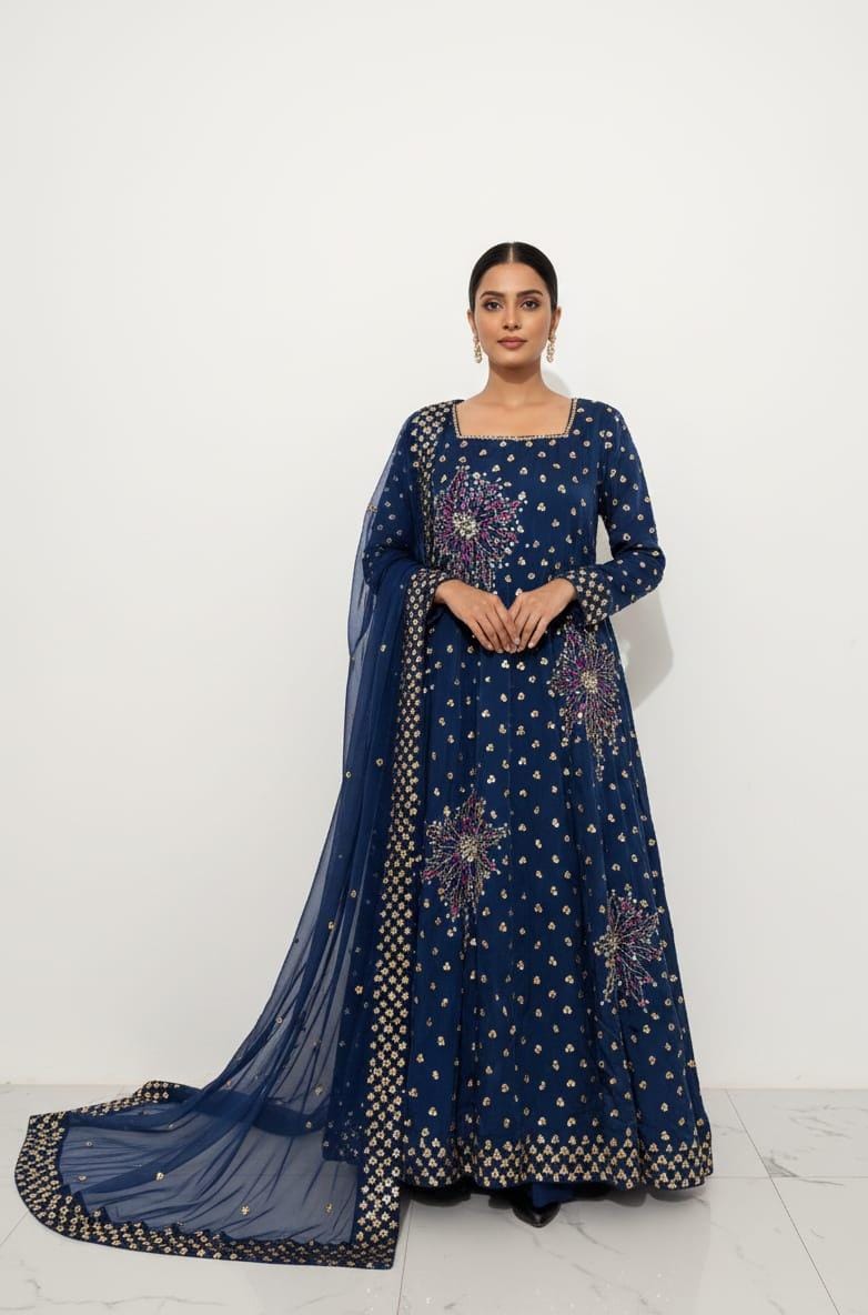 MILAH by Madiha presents an exquisite , a true symbol of elegance, luxury, and fine handmade craftsmanship. This stunning outfit is crafted from premium quality silk fabric, giving the maxi a smooth texture, rich shine, and a graceful flow that enhances its royal appearance. The beautiful blue shade reflects sophistication and timeless charm, making it a perfect choice for weddings, festive occasions, formal events, and special celebrations.