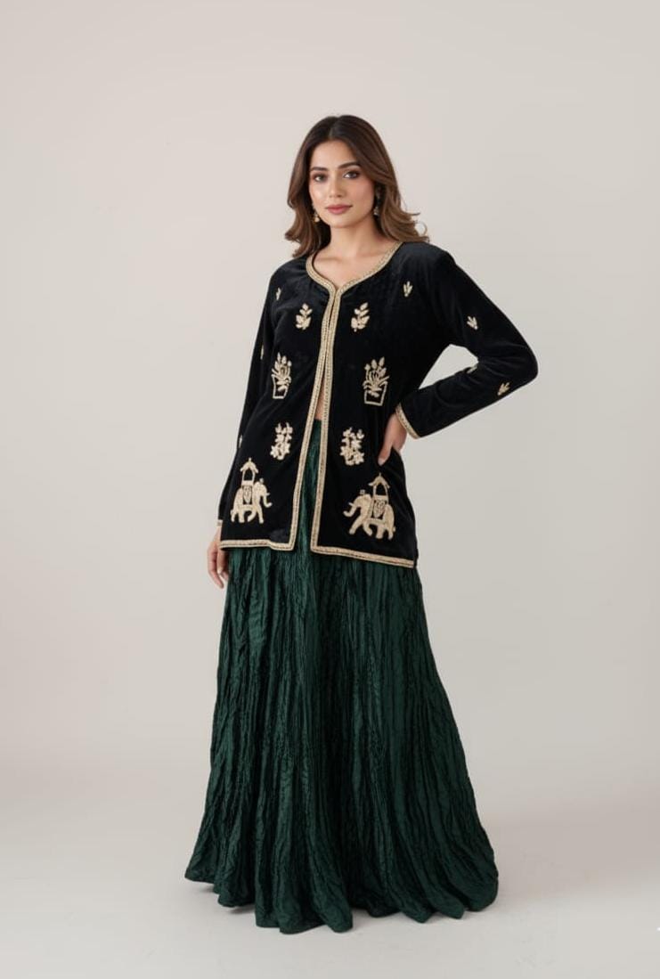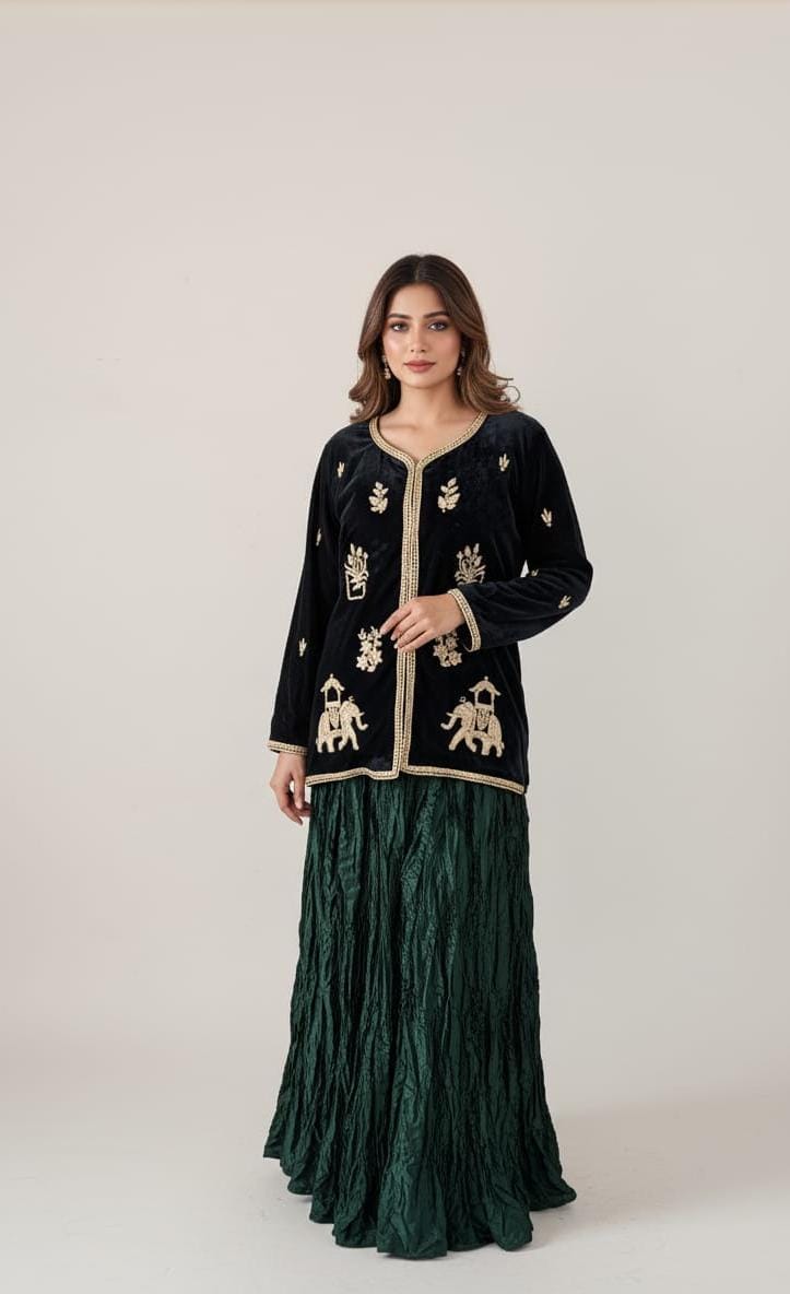 The shirt is crafted from , known for its soft texture and regal finish. Paired with a matching Velvet trouser, the ensemble creates a powerful and graceful look that speaks of elegance and class. The deep, dark color palette adds a dramatic and refined appeal, making this outfit ideal for weddings, formal gatherings, and special evening occasions.