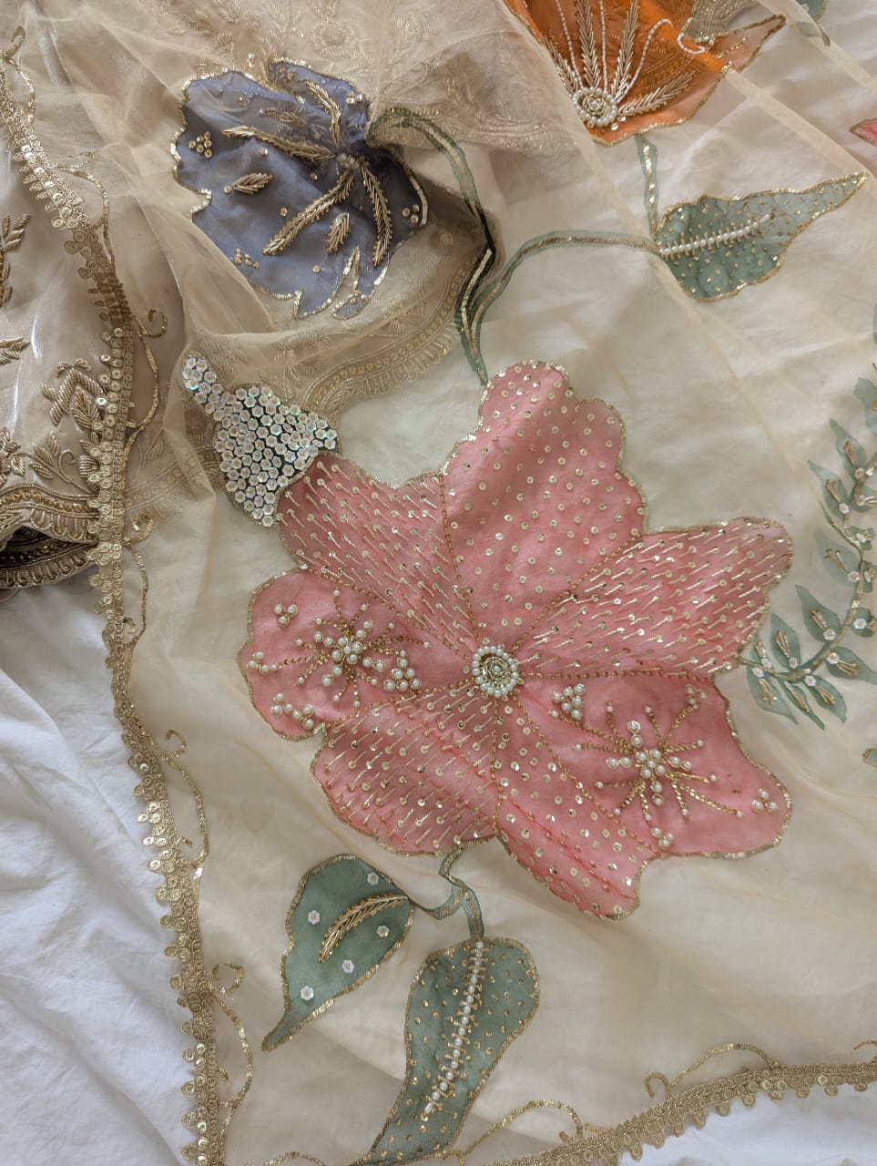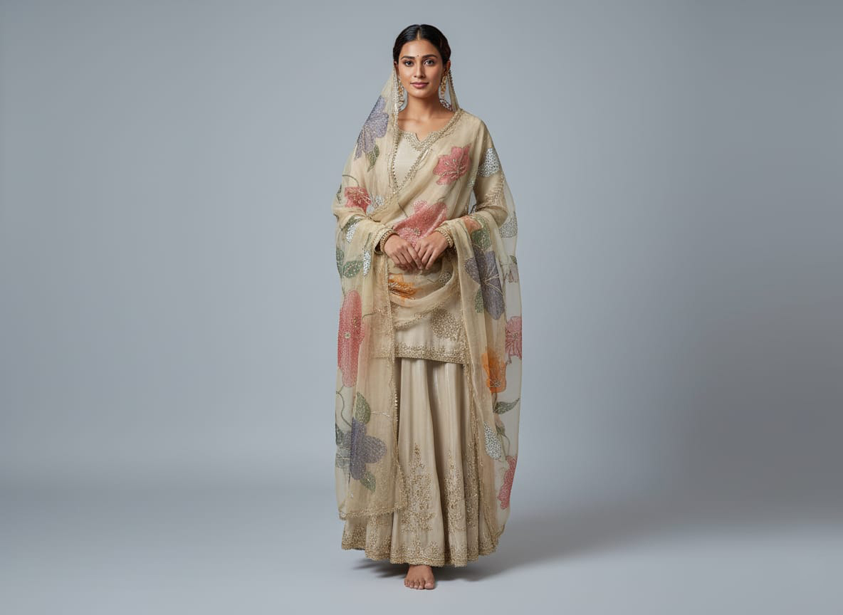 The ensemble is paired with a lightweight organza dupatta, adding fluidity, grace, and movement to the outfit. Every stitch and embellishment reflects the artistry of skilled designers and artisans, making Spring a truly timeless and luxurious choice.